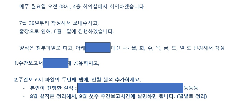 그리고 주간보고서도 문제이다. 그냥 하루하루 일하는것도 바쁜데 왜 월화수목금토일 내가 한일을 적어서, 같은부서지만 전혀 다른 부서사람들한테 알려줘야하나;;;;;